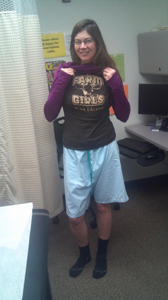 Couldn’t resist wearing my favorite shirt “Farm Girls Have Nice Calves” while doing a series of tests to determine what is wrong with my leg. Most likely I will have to wear this shirt Thursday as well when I do the MRA 🙂 I have to make the most of my situation and Tim is nice enough to just smile, shake his head…and take the pictures!