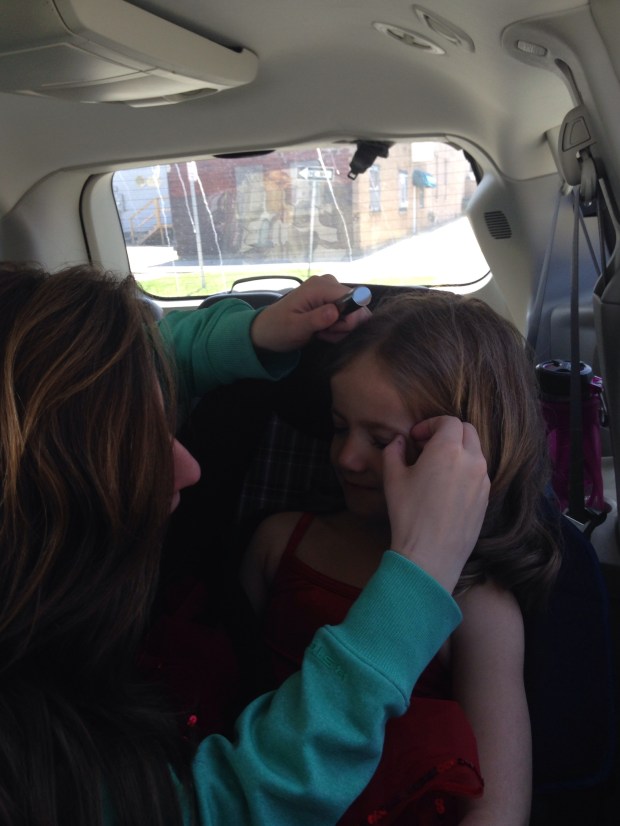 But, after Skyler and I snipping at each other and rushing around to make sure we had tights and shoes and hair pieces, it all worked out! Leah looks beautiful…oh but her red hair piece…I honestly thought it was a bow tie that went around her neck! Haha!