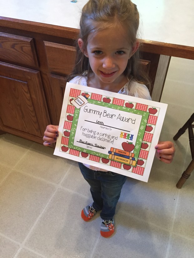 Tonight we celebrated our little girl graduating from preschool. It was a really big deal! Leah and her class put on a program where Leah really belted out the words….along with some sweet dance moves! Followed by the award ceremony and potluck. I am proud to say that Leah got the Gummy Bear award for being a “caring and huggable classmate”…she must get that from her mommy π
