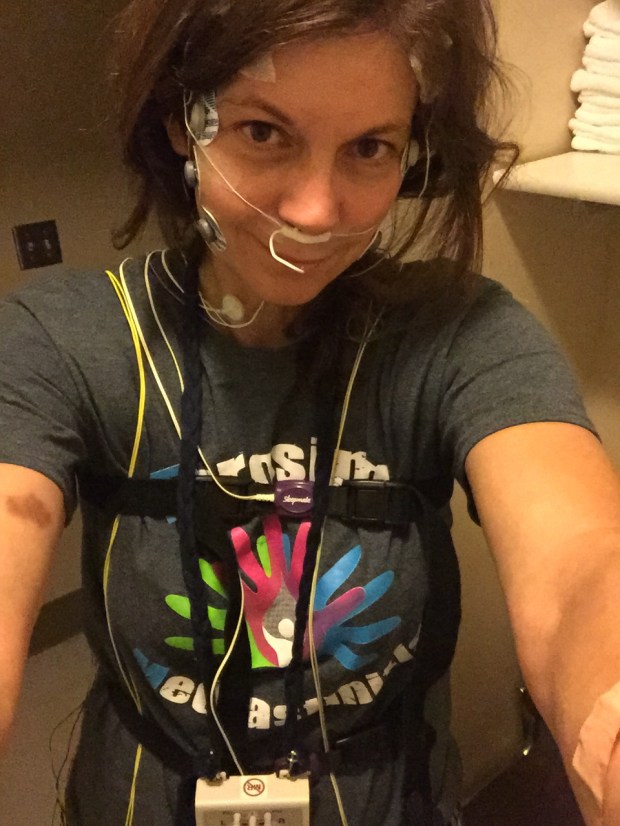 I’ve got wires everywhere!! On my legs to test for restless leg syndrome, belts around my chest and stomach to determine my breathing pattern or something, wires on my face, in my hair, on my chest, a wire taped to my throat, a tube taped in my nose to monitor my breathing and then I also have the oxygen clip taped to my finger. Yeah, let’s see how well I sleep!