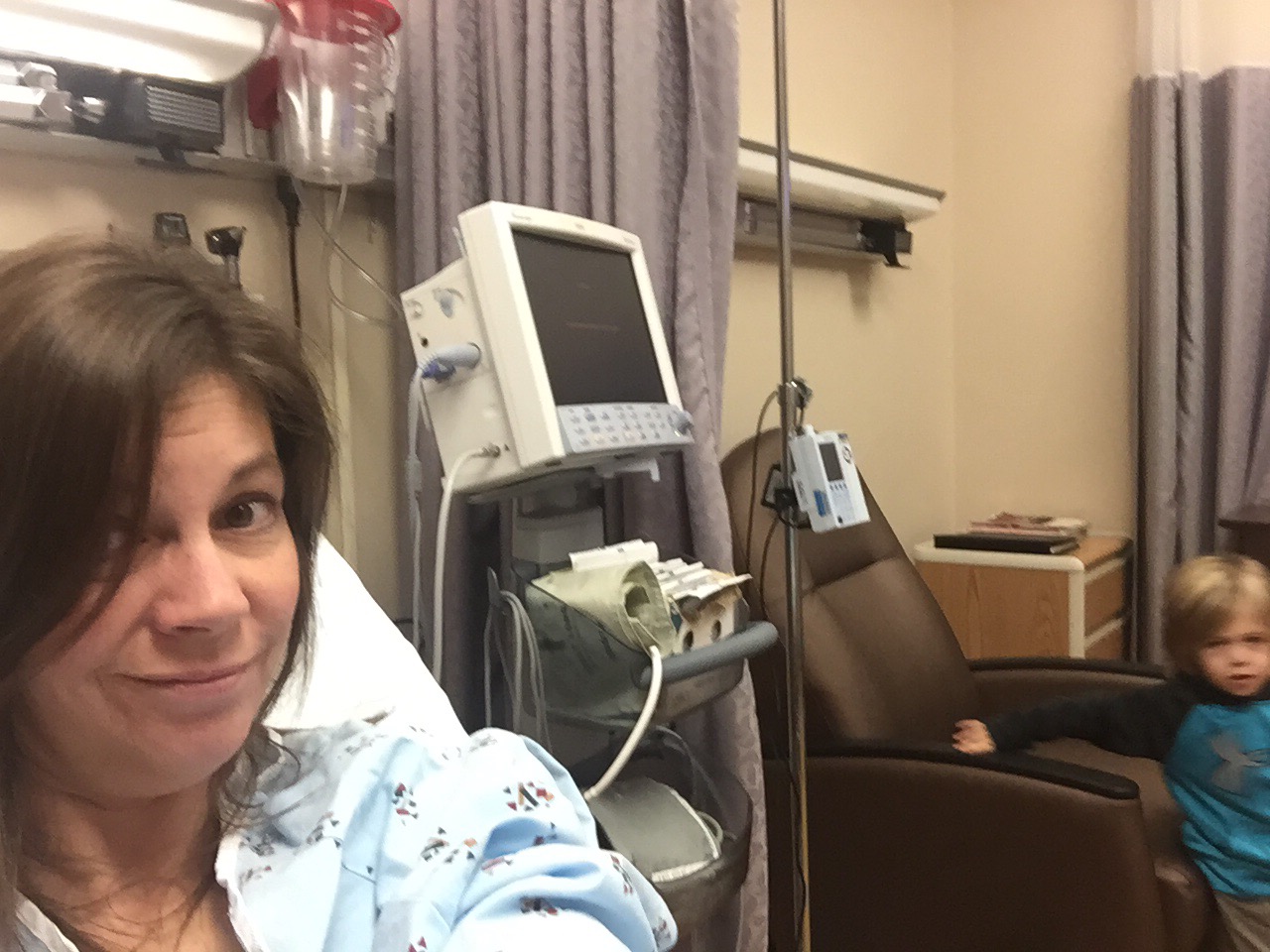 While Leah did great and sat quietly coloring, it only took a few minutes for Asher to realize it was a free for all. In no time he was throwing colors and digging through my purse throwing whatever he could get his hands on. But after I had to chase him out of my room trying to keep my IV from ripping out and my gown from falling down, I sent Tim the text…”get here now!” Thankfully Tim showed up just before they came in to take me for my chest X-ray.