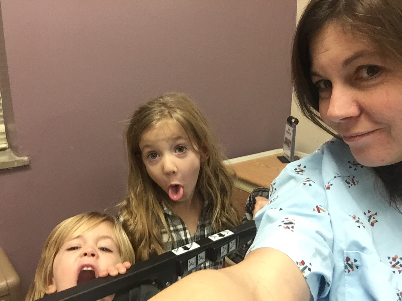 I was escorted to the emergency room where an IV was started, an ekg was done as well as lab work and then a chest X-ray was to follow. In the meantime I had texted Tim letting him know that my trip to the clinic had resulted in an ER admit. So there I sat in my gown with an IV, along with Leah and Asher waiting patiently to get my X-ray done…