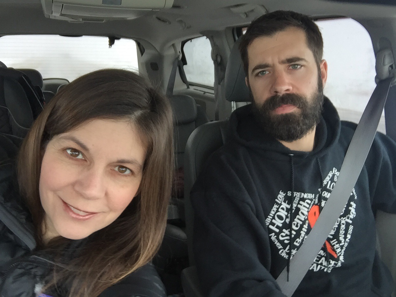 So while the new year has started and Tim and I continue to be faced with many challenges, I think we have both done pretty well at staying focused on the positive and not letting this all get us down. Tim is quick at making me laugh when he knows I am ready to cry out in frustration! And with a big appointment today I am extremely grateful for his company and humor….but let’s skip the cross eyes while driving in the fog! Haha kidding mom!! We were parked π€