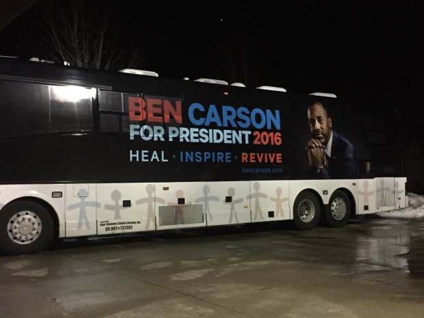 As we were heading back to the hotel, we saw Ben Carson’s bus so we pulled over to snap a picture. Child locks were on so it took Tim forever to get them figured out in the dark but I finally got that picture…