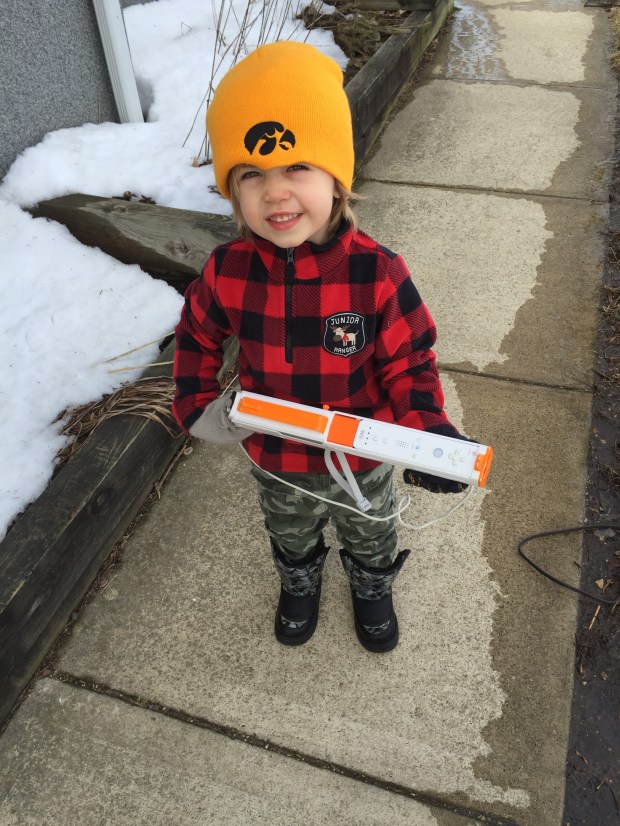 Asher and I decided to play outside for a little bit this morning after the kids got on the bus. As we were walking around the corner of the house, we heard an extremely loud bellow and Tim instantly said “we have a cow dying.”