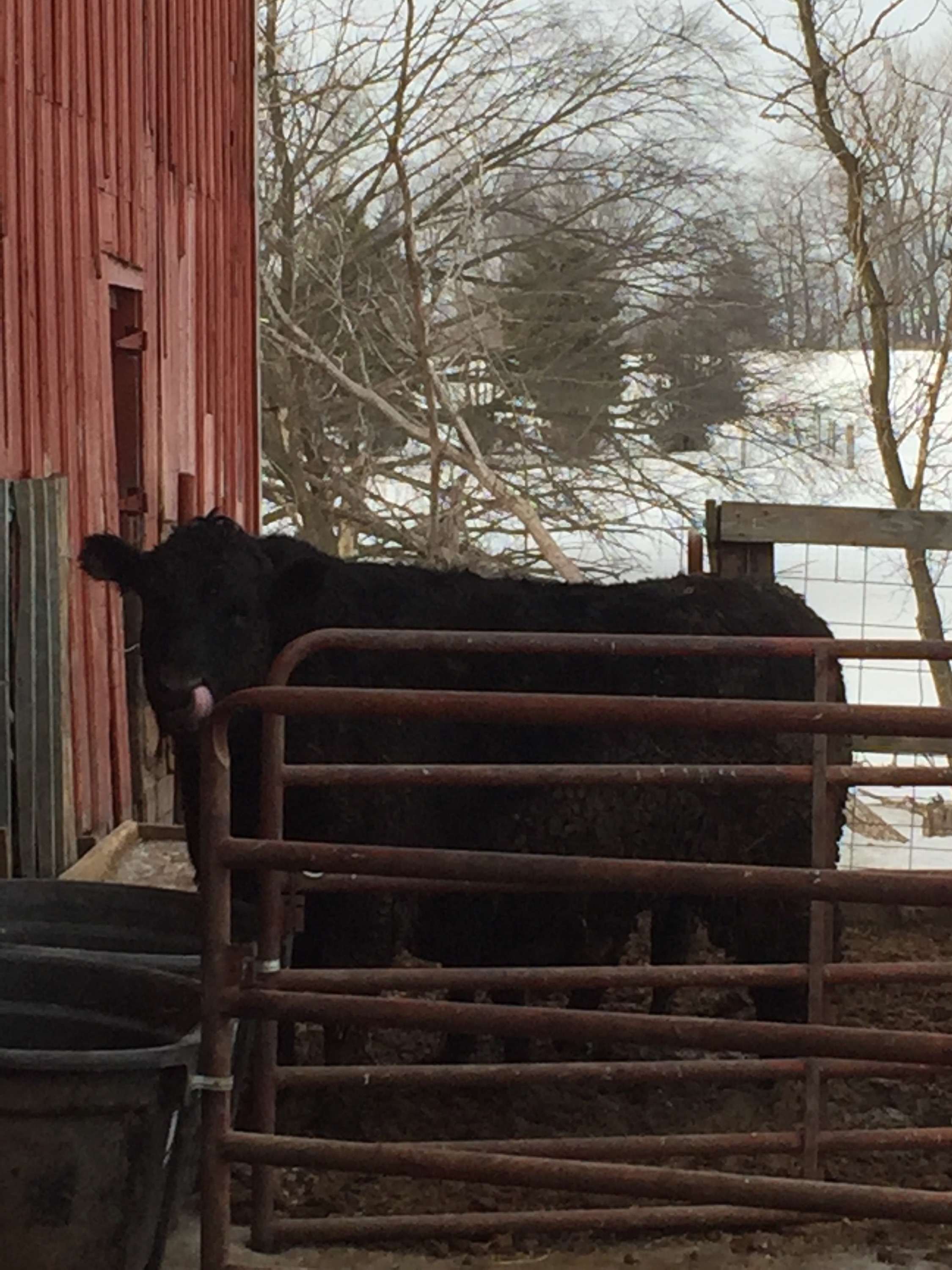 Apparently the cow was able to bend the gate over and reached the cord of the heaters used to keep the waters from freezing…kind of ironic huh?!