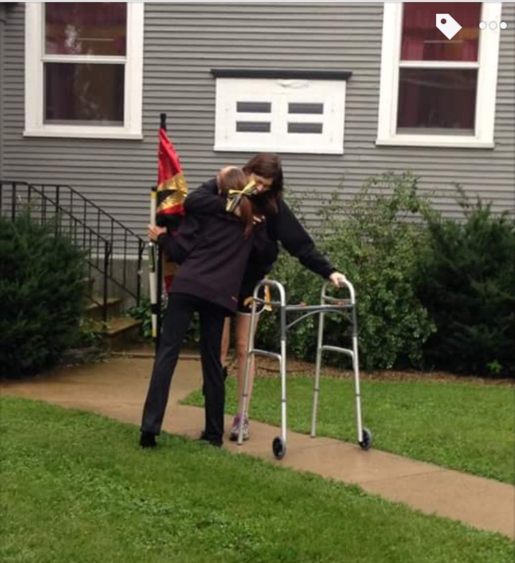 I thought that was weird because he is always on me making sure I’m doing exactly what the doctor says but whatever, so in my lounge Iowa Hawkeye shorts and sweatshirt, Tim helped me up the stairs then I put on my fancy foot brace along with my tennis shoes, grabbed my walker and went outside to see Skyler and the entire colorguard standing in my driveway! π©ππ©ππππ