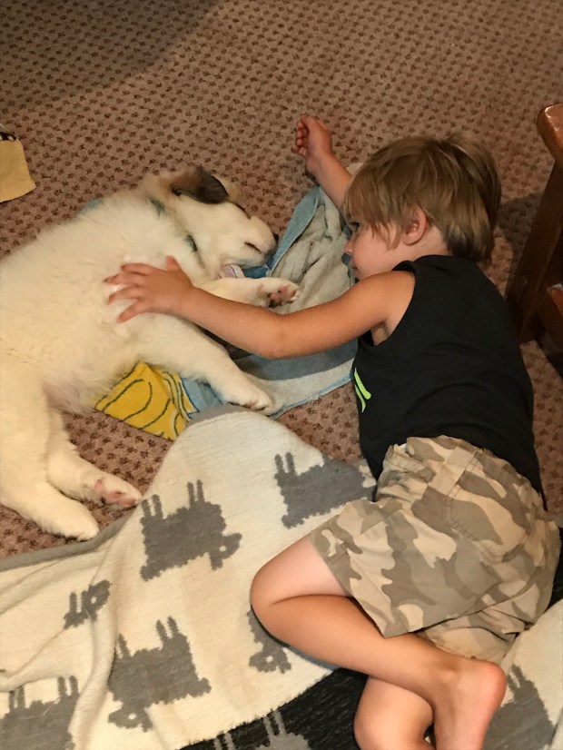 While she has been inside the house since we got her, we haven’t completely decided that she will be an indoor dog. If anything, she will stay inside until Tim can get the outside all ready for her with an invisible fence and dog house. But she sure is making herself comfy until then and the kids are loving so much on her…
