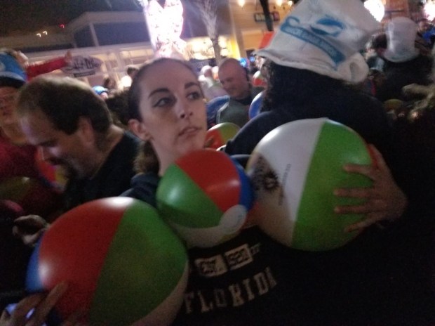 As it got closer to the drop, Asher and I decided to join them in the streets. Actually…Tim had to talk me into coming over by them and I am so glad he did! I told Asher to wrap his arms around my leg and no matter what…not to let go. I mean, we had heard some wild stories about how crazy it got so I was just ensuring that our kids would not get separated from us!! Soon enough, people started to volley really big beach balls!