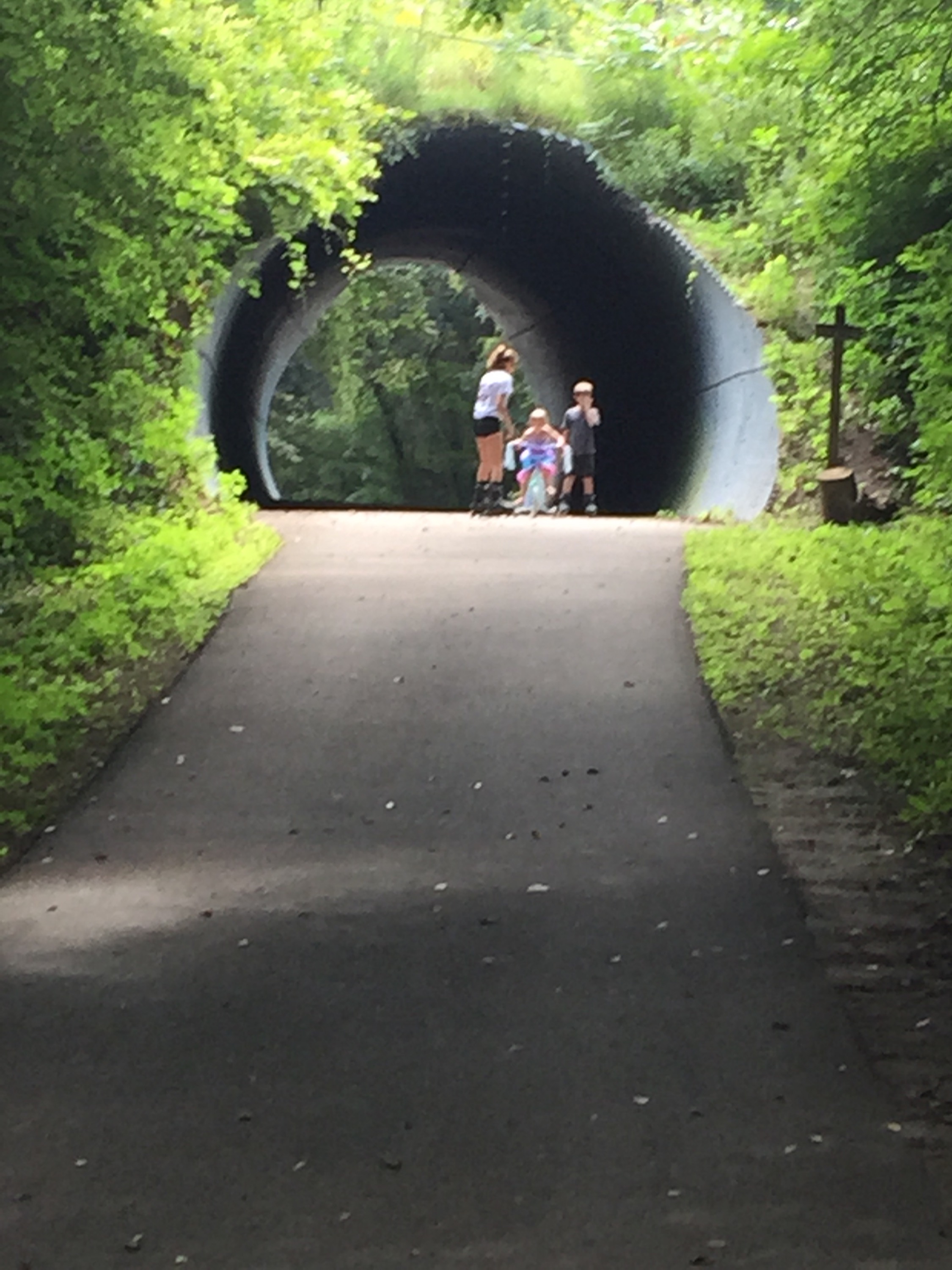 This is the mile marker right after the tunnel, but that hill!! How do I forget about it every time?! And here’s my confession of being a bad mom…instead of telling the kids to walk down in the grass…I simply did not watch them go down!!